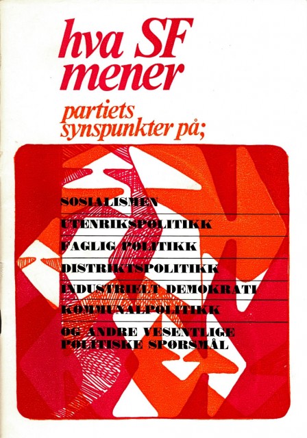 Dette heftet inneholder Sosialistisk Folkepartis stiftelseserklæring, prinsipprogram, arbeidsprogram, distriktspolitiske program, kommuneprogram og vedtekter. Inkludert er også kontaktinfo til samtlige lokallag anno 1. januar 1968.