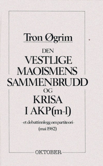 Tron Øgrim (1947-2007) var en norsk journalist, forfatter og politiker. Han var en viktig ideologisk drivkraft i den norske ml-bevegelsen. Øgrim var blant annet initiativtaker til forlaget Oktober, plateselskapet MAI og avisa Klassekampen. Øgrim ga også ut flere science fiction-bøker og var en viktig bidragsyter til Wikipedia.Den vestlige maoismens sammenbrudd og krisa i AKP(m-l) er Tron Øgrims forsøk på å utvikle en egen partiteori. Her drøfter han den norske ml-bevegelsens opphav, vekst og fall, samt årsakene til kollapsen i de vestlige kommunistpartiene på slutten av 1970-tallet og begynnelsen av 1980-tallet. Han utforsker motsetninga mellom «virkelige parti» og formelle partiorganisasjoner, forklarer hvorfor maoismen var utilstrekkelig som politisk rettesnor i Øst-Europa og hvorfor den vestlige maoismen ikke var «vestlig» nok.