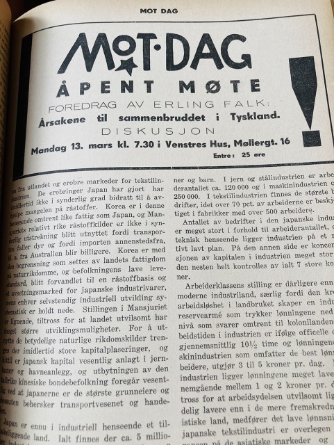 Mot Dag var et norsk tidsskrift, utgitt fra 1921 til 1936 av den kommunistiske organisasjonen med samme navn. Det ble etablert i 1921 etter initiativ fra Erling Falk, dels med utspring i debattfora i det sosialdemokratiske studentting i Oslo (senere Studentenes Kommunistorganisasjon); dels fra en Falk-ledet studiesirkel som fra 1919 involverte Viggo Hansteen, Axel Sømme, John Hazeland og Arnold Hazeland. Første redaktør var Sigurd Hoel. Organisasjonen Mot Dag var et kollektivt medlem i Det norske Arbeiderparti fra mars 1922 til august 1925, men ble ekskludert etter en rekke uoverensstemmelser. I årene 1927–29 var Mot Dag med i Norges Kommunistiske Parti. De tilknyttede ble kalt «motdagister». Mange kjente forfattere, intellektuelle og senere ledende politikere og embedsmenn var blant dem. Av disse kan nevnes filmregissøren Olav Dalgard, forfatterne Odd Eidem, Sigurd Hoel, Arnulf Øverland og Inger Hagerup, senere sjef for Norges militære etterretning Vilhelm Evang, senere sjef for Overvåkingspolitiet Asbjørn Bryhn, senere helsedirektør Karl Evang og senere professor Johan Vogt, som sammen med Falk sto bak den første oversettelsen av Kapitalen til norsk. Dette bindet samler den komplette 1933-årgangen av tidsskriftet. Inneholder stoff om blant annet krisepolitikk, Arbeiderpartiets religionslitteratur, rasepolitikk og reaksjon, teater og antikrigsagitasjon, seksuell opplysning, skandinavisk kriselitteratur, Riksdagbrannen i Tyskland, kommunistisk taktikk, Grønlandssaken, materialistisk historieoppfatning og den moderne fysikk. Inneholder også novellen Mamaj av den russiske forfatteren Jevgeni Samjatin og et utdrag fra romanen Jim av amerikanske Scott Nearing.